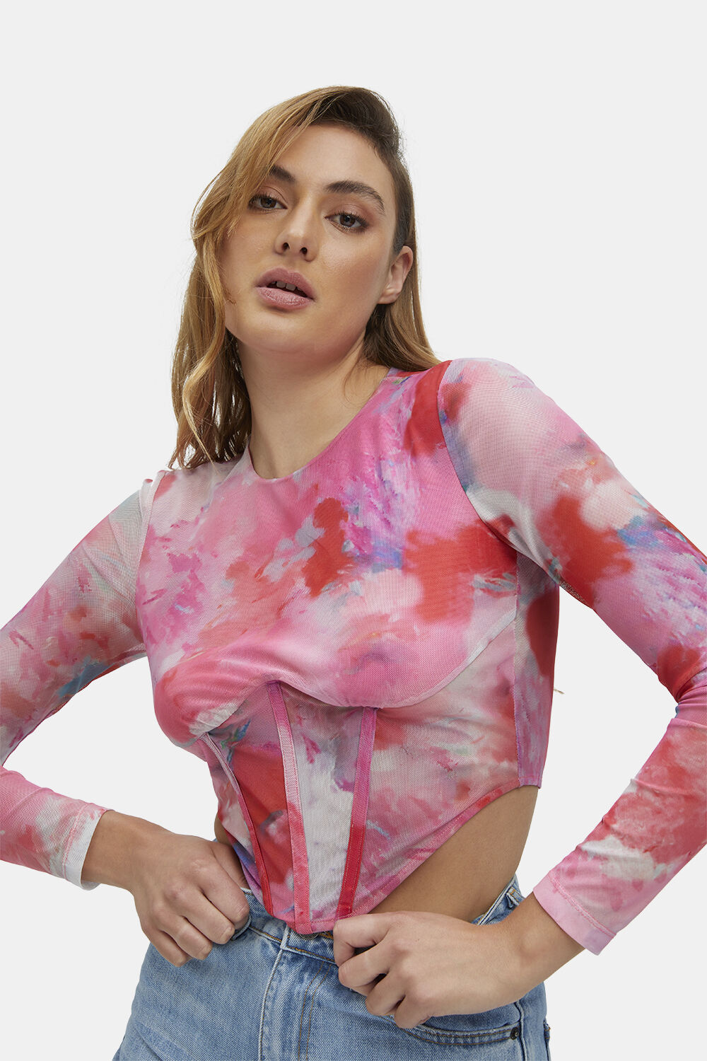 Entrance defining. A dramatic femme fatale silhouette sheathes the body, while sheer sleeves and corset panelling create tacit allure.